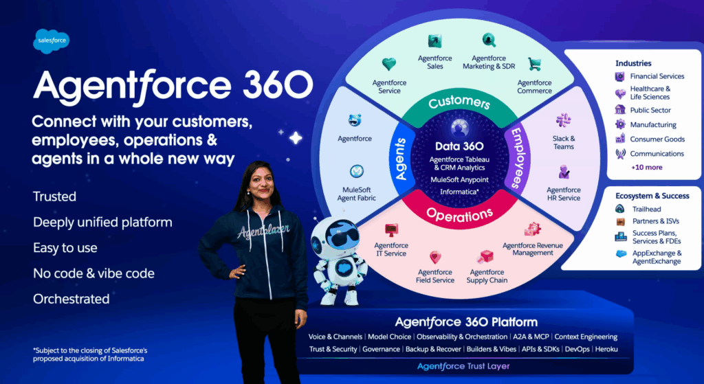The keynote unveiled Agentforce 360, Salesforce’s rebuilt platform integrating AI agents across all enterprise products. The platform offers: